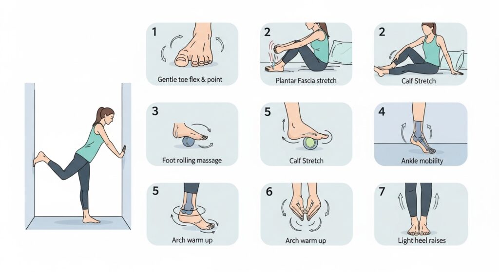 - 아침 발바닥 통증 핵심: 족저근막 단축·종아리 긴장·수면자세·부하 문제.