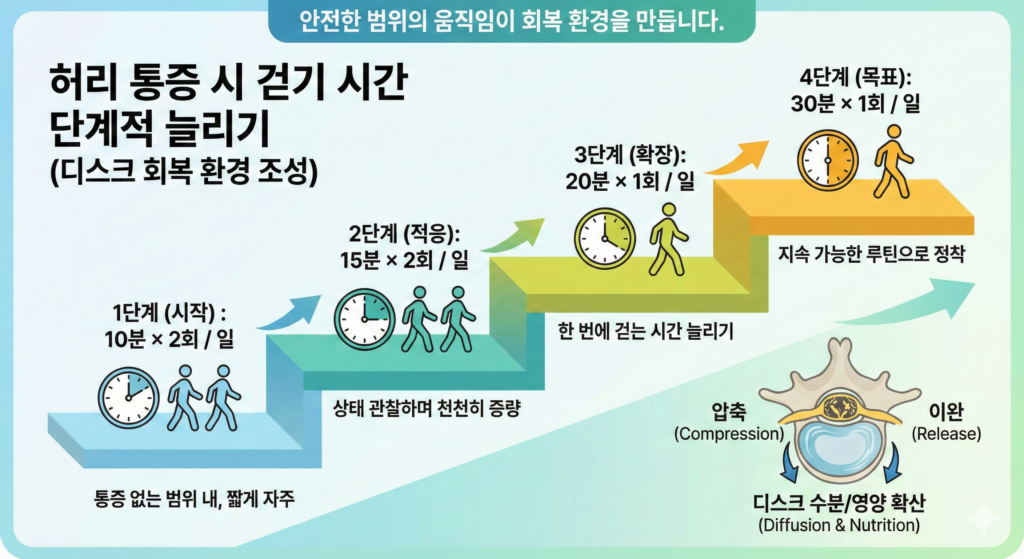 허리 통증이 있을 때 ‘침대’보다 ‘걷기’가 먼저인 이유: 디스크·신경을 위한 안전한 산책 가이드